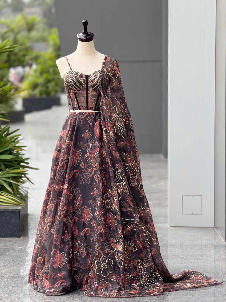 Lehenga – Pure Jimmy Organza digital printed lehenga with a grand 8-meter flair. Comes with canvas patta, can-can, and adjustable waist dori for a perfect fit